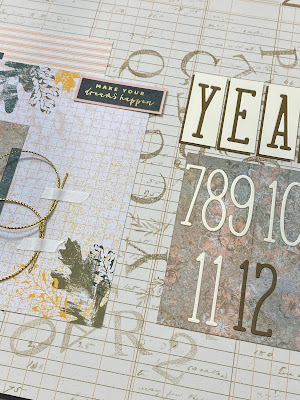 I used a variety of stamp sets to create my background as well as paper and cards from the Texture Chic Memories & More Pack - it had some very appropriate stickers in it so I made them into little embellishments for the page also.